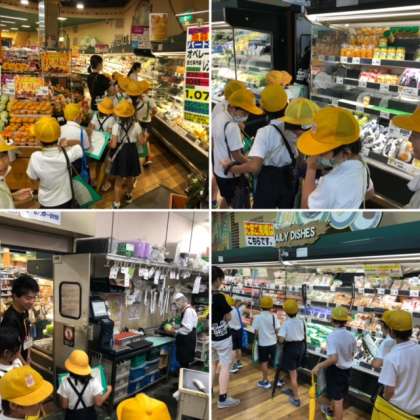 子どもたちは小雨の中、地域のスーパーマーケットへ社会見学に行きました。