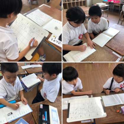 「まちがったっていいんだよ。自分からチャレンジすることが大事!」と先生からの言葉がけに、子どもたちは安心して答えを追求します!この安心感がいいんです!さらに、これまでの1人の学びを近くの友だちとの学びへと広げていきます!自分の言葉でお友だちに説明する姿は、まさに「自分で考えて行動する風船」をふくらませています!そして、お友だちの考えをしっかりと聴く姿は「自分も人も大切にする風船」を大きくしています。