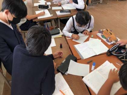 子どもたちはグラフを使って、比例の学びをしています。グループに分かれての少人数の学びです!