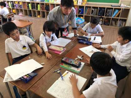 おはじきをつかって、問題を見える化しています。できた子どもは困っている子に寄り添います。とてもステキな空間でした。