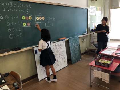 子どもたちはグループになって、かけ算の学びにチャレンジしています。