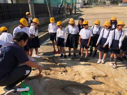 運動場の土山を利用した人工の川を使って、水の様子を観察しました。担当の先生の手作りの川には、外側と内側にそれぞれ小旗をたてて、水の流れによって形を変えていく川の姿に発見することがたくさんありました。