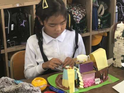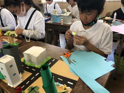 子どもたちが平面でイメージした「自分の住みたい街」が立体化されてきました!