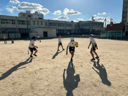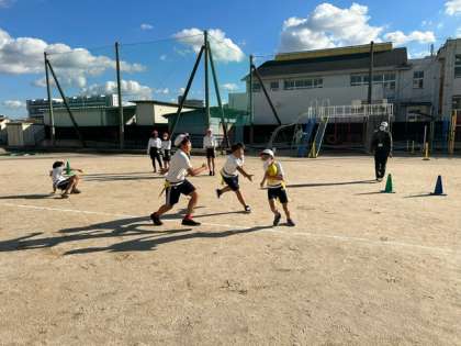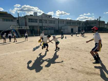 タグラグビーで盛り上がる子どもたち。タグを取られるとボールをはなします!タックルなど接触はありません。よく考えられたルールです。