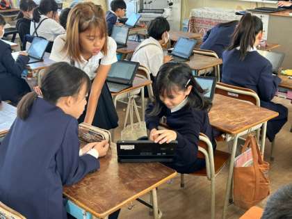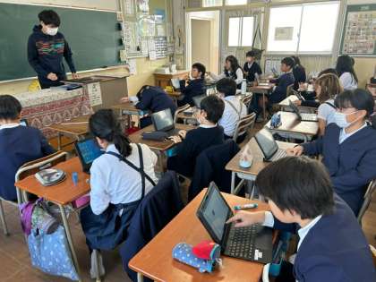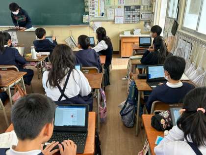子どもたちは1人一台端末を使って、各自が和の文化についてのパンフレットづくりにチャレンジしています。