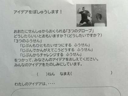 次に、みなさんもご存知と思いますが、メジャーリーガーでMVPを獲得した大谷翔平選手から全国の小学校にグローブが寄贈される話題について話しました。この3つのグローブ(※まだ届いていませんが)を「どうしたい?」「どうしたらいい?」を学校中のみんなに考えてもらうことにしました。