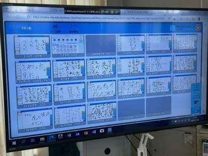 タブレット操作も上手にこなし、指でなぞりながらたくさんの意見を出します。スクリーン上には一斉に子どもの意見が並びます。ICTの活用があたりまえになっています!
