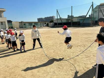 まぶしい日差しの降り注ぐ中、子どもたちが大縄に全員チャレンジしています。