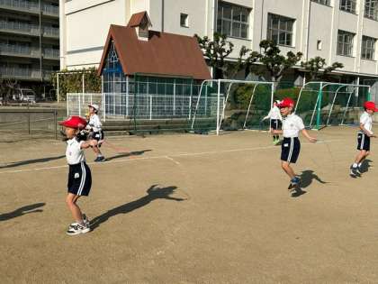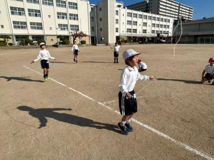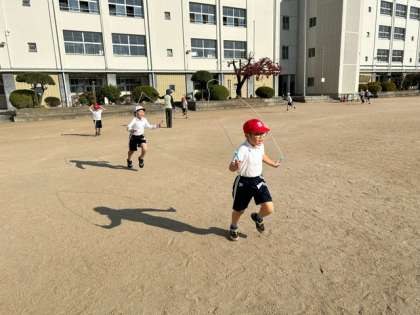 前とび、後ろとび、自由とびと子どもたちは自分ができる技にチャレンジしています。また、なわとびしながら走ろう!では、運動場を大きく2周しようと一生懸命に走る姿がありました。