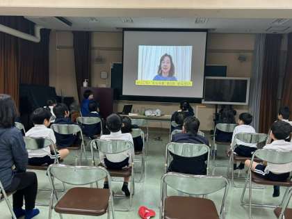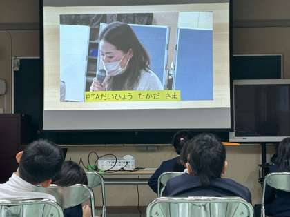 校医先生からのメッセージやPTA代表の方からのメッセージを聞きながら、よく噛んで、よく食べるために必要なことを学んだ子どもたちです。