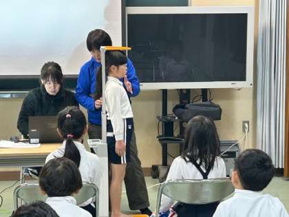 発育測定の前に、昨年末に開かれた健康委員会のみなさんによる「学校保健大会」のビデオ映像から学びました。
