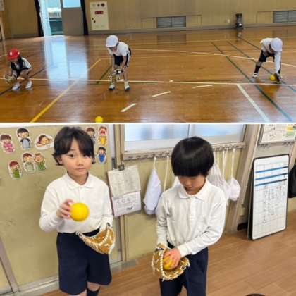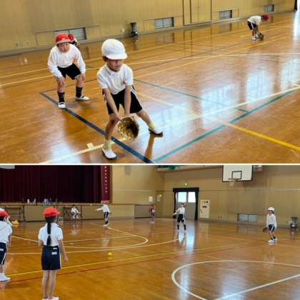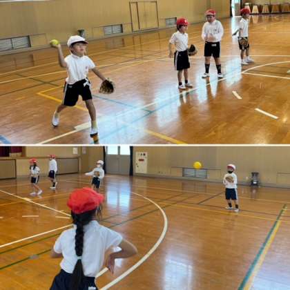 まずは体育です!雨のため体育館で、子どもたちはグローブに触れました。