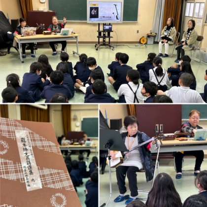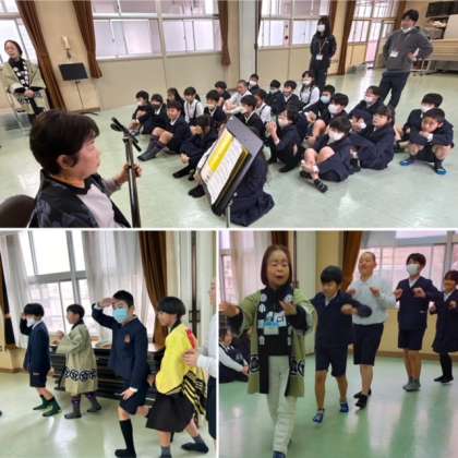 三味線のしくみを知ったり、実際の音色を聴かせてもらったりして、三味線の魅力に触れることができました。また、三味線の音色に合わせて、「さくら」や「ふるさと」や「春が来た」などの歌を歌って楽しみました。