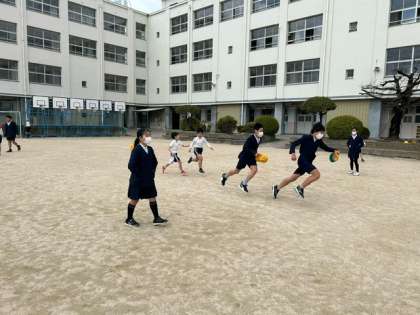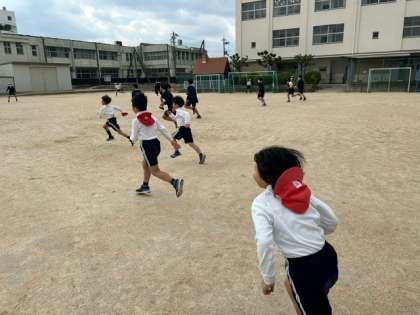 運動場に広がって、鬼ごっこです!お兄ちゃん、お姉ちゃんたちから、必死で逃げようとする2年生!そして、笑顔で追っかけるリーダーたち!