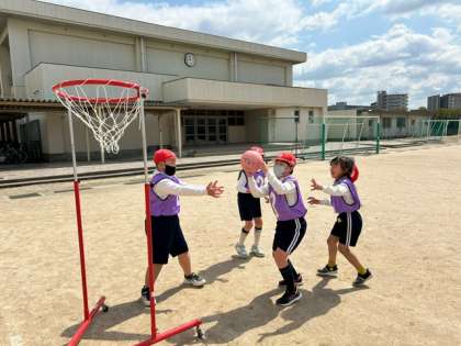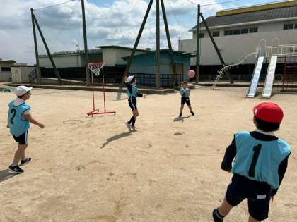移動式バスケットを使って、バスケットボールの学びです。