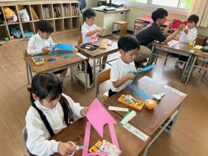 子どもたちは上手にハサミを操作していました。保育所や幼稚園でしっかりと工作の力が身についている子どもたちです。