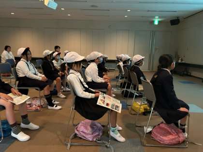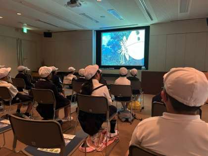 まずは4階まで上がって、「座学タイム」です。最初に「ゴミについてのアニメ」鑑賞し、平野工場の全容を学びました。「ゴミの分別はなぜ必要か?」「ゴミを燃やすのはなぜ?」「燃やした熱でつくるものは?」「燃やした後はどうなるのか?」など、クイズ形式で学びました。子どもたちは真剣な眼差しでVTRに釘づけでした!