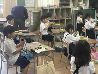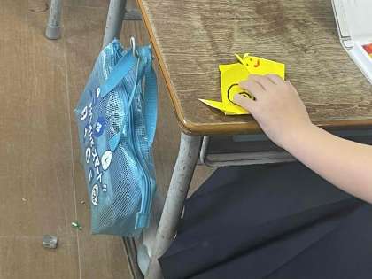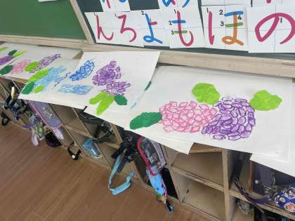 画用紙にあじさいを描き、色紙をくしゃっと丸めて広げて葉っぱをつけて、最後にかたつむりを折って、あじさいの周りに貼って完成です。
