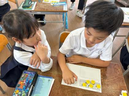 絵をもとに、ブロックを使いながら、操作活動に取り組む子どもたちです。