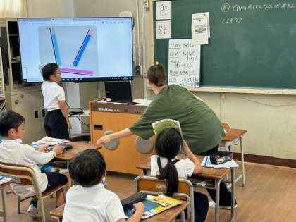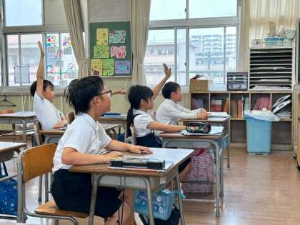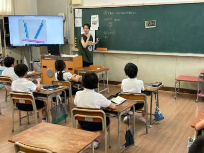 子どもたちは最初は「見た感じ」とか「手を使って測ると」のような方法をいろいろ考えています。前に出て堂々と発表する子どもたち。