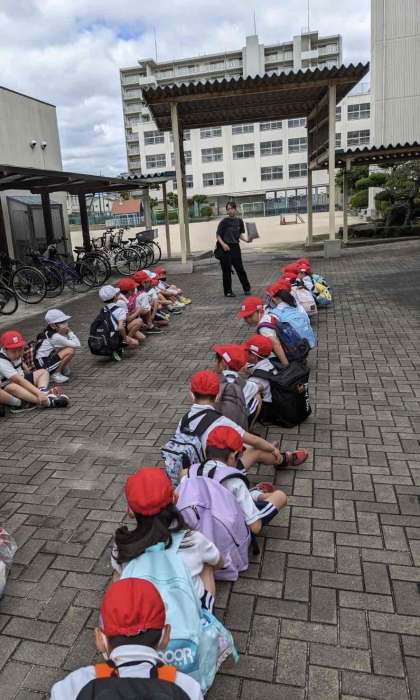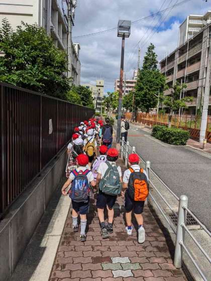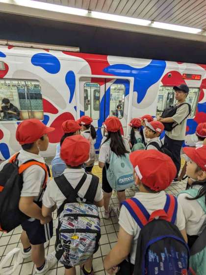 昨日の大雨とは打って変わって、青空の見える良い天気の中、ミャクミャクの描かれた電車に乗って、キッズプラザに向けて出発しました。