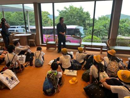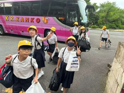 予定より10分ほど早く行動できています。お天気も今から下り坂の予報です。開舎式を終え、お楽しみのお部屋へ向かう子どもたちです!みんな元気です!