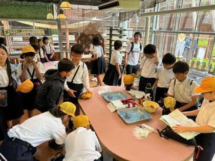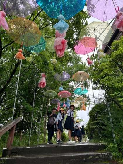 途中のてるてる坊主が子どもたちに微笑んでいます!雨を止めてくれていますね!ありがとう!