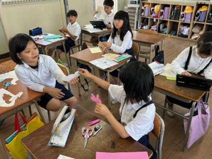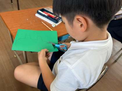 子どもたちは、ハサミを上手に使って、自分の描きたい動物の切り絵をつくっています。