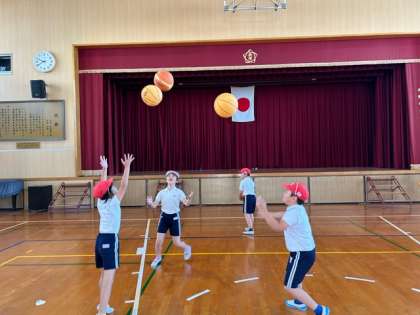 まずはボールと友達になること!パスしたり、投げ上げたり、グループで回したりと、様々な動きをしながら、ボールに慣れるところから始めています。
