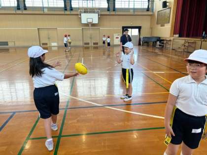楕円形のボールの行方は誰もわからない!そのボールを上手にパスしながら、チームで力を合わせてゲームを楽しむ子どもたち!