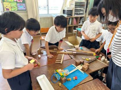 子どもたちが「ピタゴラスイッチ」にチャレンジしています。