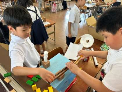 ビー玉をスタートさせる時のドキドキ!玉が転がる時のワクワク!上手くいったときの喜びと思い通りいかなかったときの残念感と次へのチャレンジ意欲の高揚!子どもたちのいきいきが教室中に広がっています!