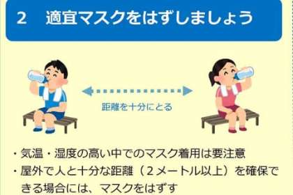 マスクを着用している場合には、激しい運動は避け、のどが渇いていなくても、こまめに水分補給を心がけてください。また、周囲の人との距離を十分にとれる場所で、マスクを一時的にはずして休憩することも必要です。