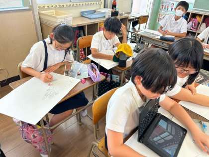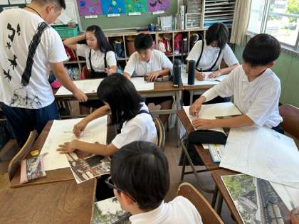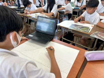 なかなかの迫力ある図柄になっていて、スケールの大きな絵になりそうです。細かい瓦の様子や、柱の一本一本など丁寧に写生する子どもたちです。