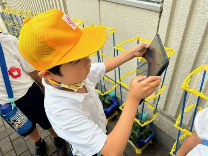 朝顔たちにお水をあげる子どもたち!またタブレットで写真撮影もバッチリできる子どもたち!