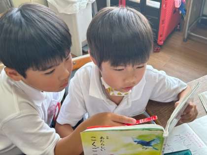 ペアの友だちと一緒に協力して、「どんなことが書かれているかな?」の課題にチャレンジしています。