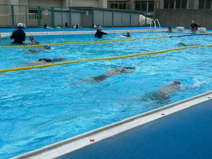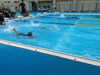 泳力別に分かれての学びです。自分の泳力に応じた学びの場を決めて、できることから始めています。友だちにアドバイスをもらいながら、先生から指導を受けながら、ひとつずつ学びを前に進めます。