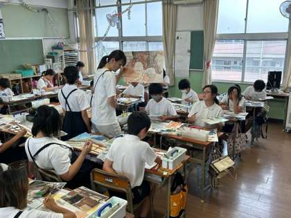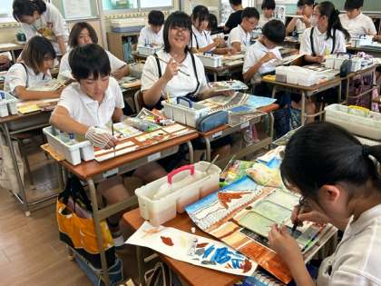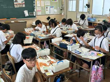 子どもたちは軽快なBGMの中、集中して筆を走らせていました。シーンとする場面ももちろん必要ですが、時として、気分を上げる心地よい音楽の効果は、脳科学的にも証明されています。いずれにせよ、自分の作品を最後まで、粘り強く、描き切ること!あきらめない気持ちやくじけない気持ちといった「レジリエンス力」が大切になります。
