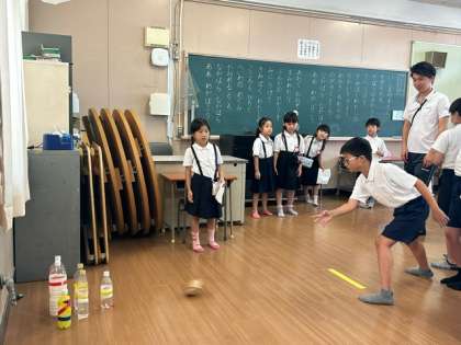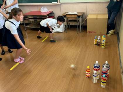 1年生横の遊びスペースに4年生の子どもたちを招待して、「ボーリング大会」が開催されました。