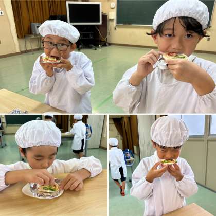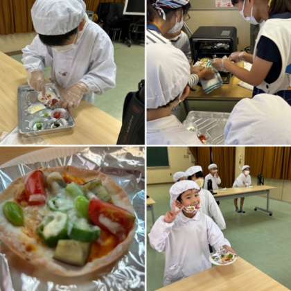 子どもたちが学習園で育てた「ナス」「プチトマト」「オクラ」「枝豆」を使って、「ピザづくり」を楽しむ子どもたちです!
