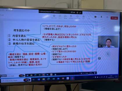 テーマは国語6年「海のいのち」を使って物語文について学びました。学びのエスコートは、本校がお世話になっている大阪市総合教育センターの指導員の方です。研修方法は、南大江小学校の研修に長原小学校がオンラインで参加させてもらう形になっています。オンラインを活用することで、これまでできなかったことや情報の共有がリアルタイムでできるようになり、研修の幅が広がっています。