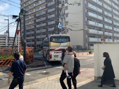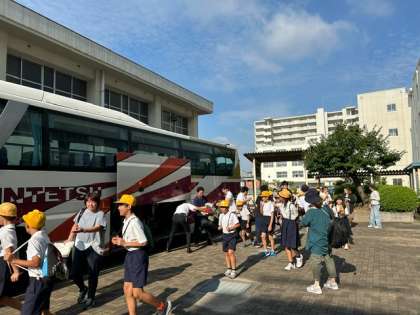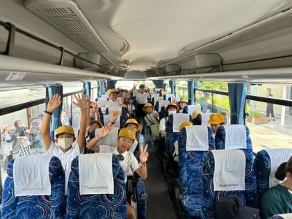 朝日を浴びながら、バスが出発しました!子どもたちは早速ノリノリ元気です!