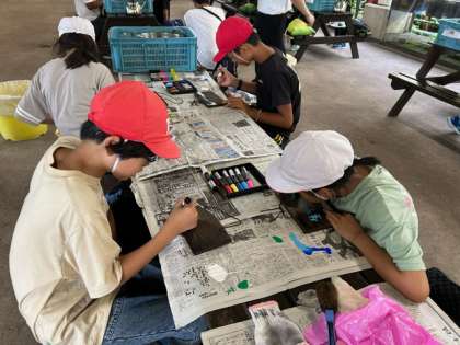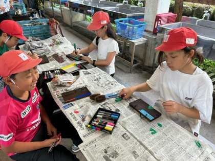 「焼き板づくり」もいよいよ楽しい絵付けです。ポスカを使って、それぞれが、それぞれに、自分らしく絵を付けていきます。