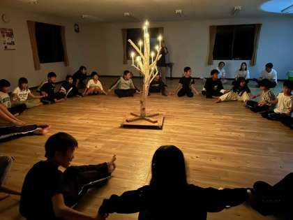 お風呂の後は、キャンプファイヤーです!と思いきや、あいにくの雨!しばらくやみそうもないため、急遽キャンドルサービスに活動を変更しました!