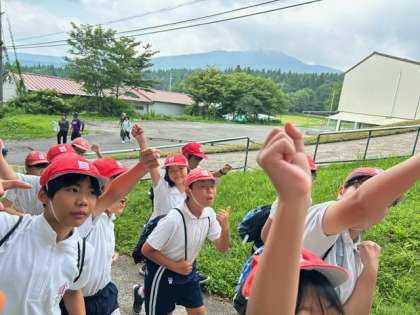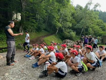 お世話になった宿舎に感謝のエールを伝えて、魚たちの待つ小川へ!