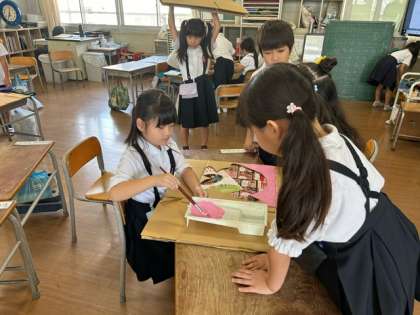 友だちとチームを組んで、絵を描いたり、色をつけたり、切り取ったりと、活動を楽しんでいます。