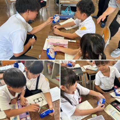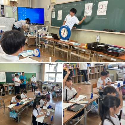 子どもたちは、時計の長い針と短い針に注目して、ちょうどの時間を学びます。自分で考えて、友だちと協力して、学びを深めていきました。