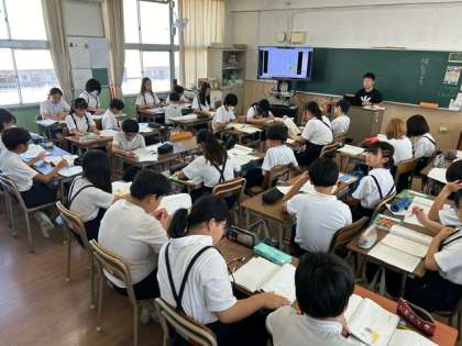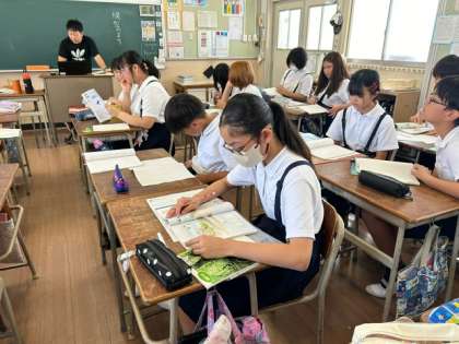 大型スクリーンには、本文が映し出され、朗読が流れます。昔では考えられない学びの環境です。朗読を耳と目で追いながら、学びを深めていきます。