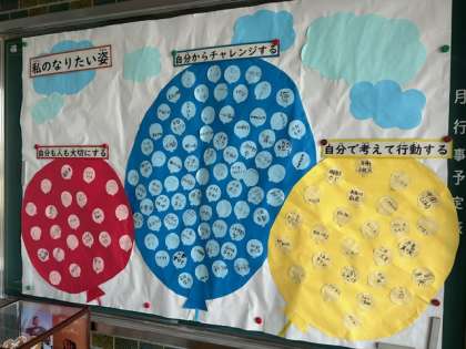 また、玄関掲示が完成しました!それは、「私のなりたい姿」です。長原小学校のめざす子どもの力である「3つの力」のどの力を今学期高めたいのか?自分がどの力を高めるのかを再確認しました。
