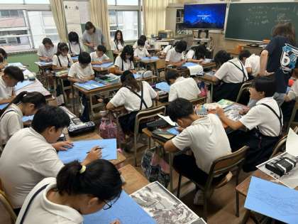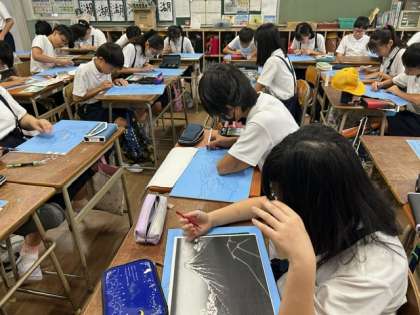 子どもたちが黙々と一枚の板に向かっています。手には彫刻刀を持ち、ひとほり、ひとほり、慎重に!安全第一に!掘り進めています。
